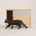 Materials: Enclosure is premium plywood with ash veneer and white semi-gloss metal, litter box is plastic, and accessories are made from matte plastic, synthetic bristles, and TPE handle for more grip. Cat Size: Suitable for all cats. Modelled by Kyro, who weighs 12 pounds Dimensions: 32”W x 19”D x 24.5”H. Max litter box size is 21”W x 17”D Cleaning: Wipe with damp cloth